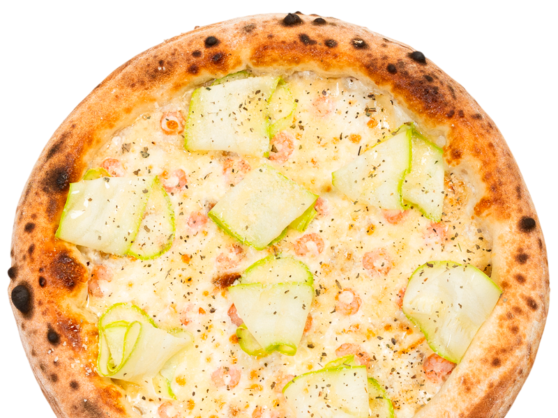Тесто, соус сливочный, моцарелла, креветка, цукини, соус Юдзу, пармезан, сушеный базилик.Вес: 540-560 г