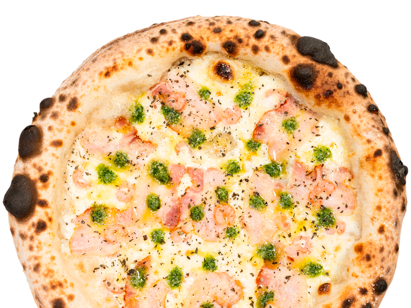 Тесто, соус сливочный, моцарелла, креветки, бекон, соус песто, пармезан, сушеный базилик.Вес: 550-570 г